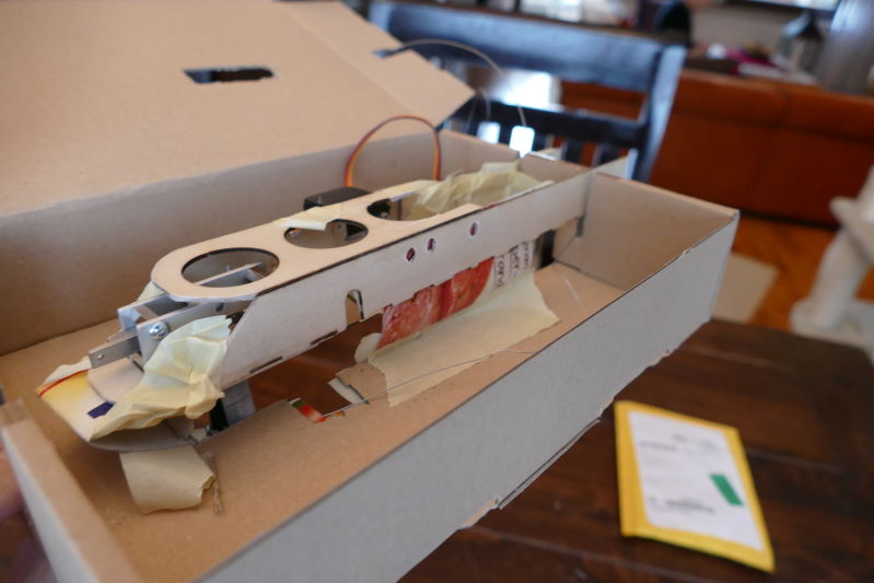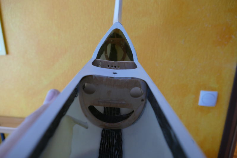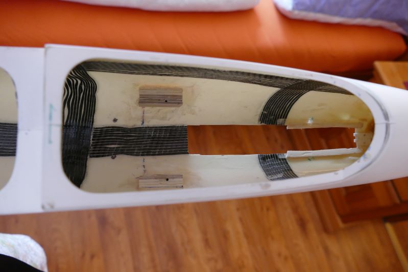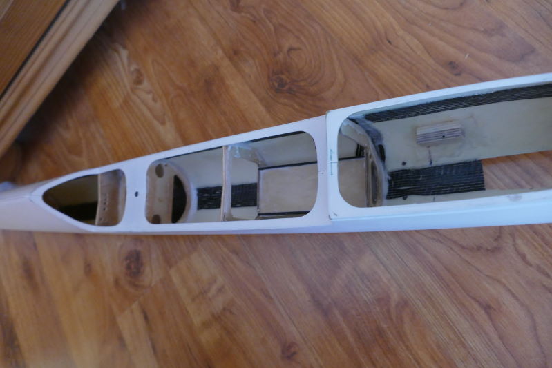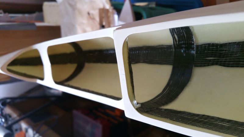 Beim Rumpf riet mir Stefan, diesen zu versteifen. Ich habe mir Kohlefaserbänder besorgt. Allerdings blieb lange das Problem wie man harzgetränkte Bänder in einen so schmalen Rumpf bekommt, während alles drum herum klebt.
