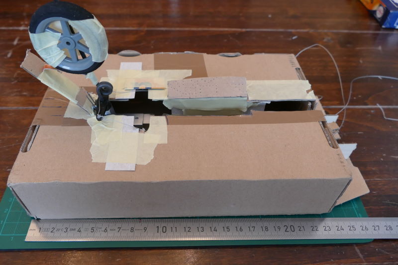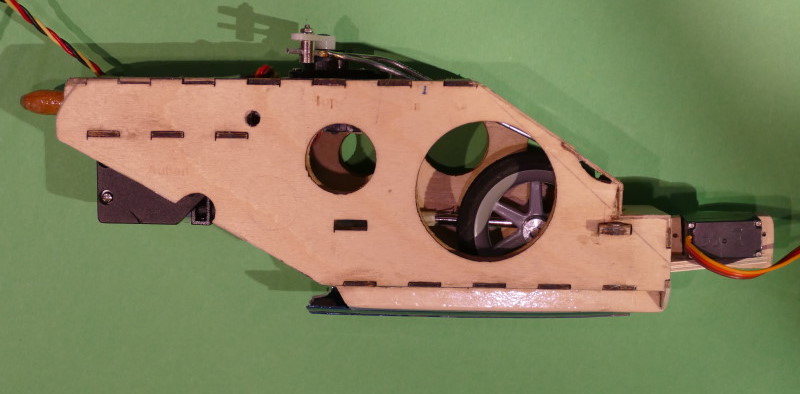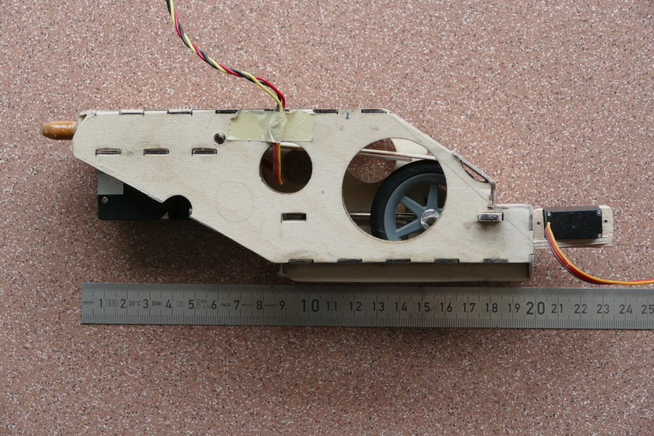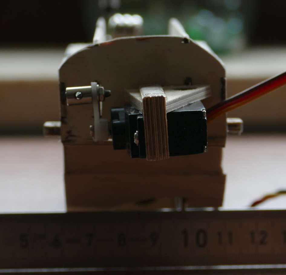 Nun gut, dachte ich mir, dann macht das eben ein Servo. Nur, das Servo konnte die Wippe nicht betätigen, denn dann würde die Wippe mit dem Rad kollidieren. Da sollte ja ursprünglich der Kraftschluß die Klappe schließen.