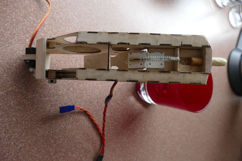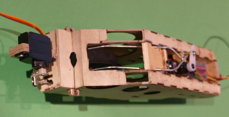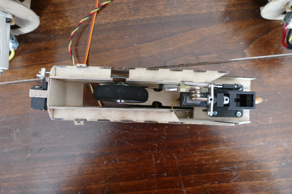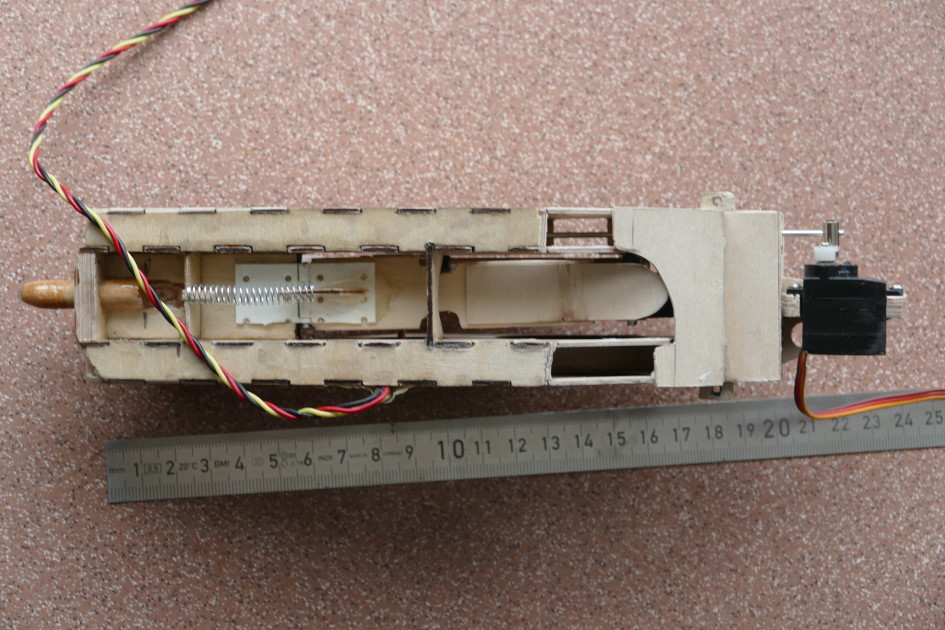 Ich habe die Mechanik komplett umdesignt. Im nächsten Schritt saß das Servo über der Mechanik und zog die Klappen zu. Das hat super funktioniert, bis ich das Teil in die Tigercat einbaute. Wo sollte nun der Akku rein rutschen, da war nun das Servo im Weg.