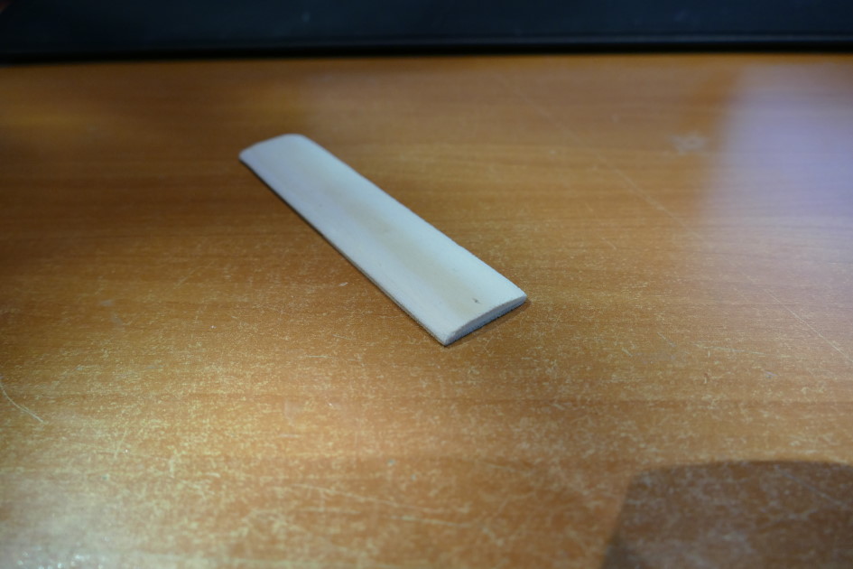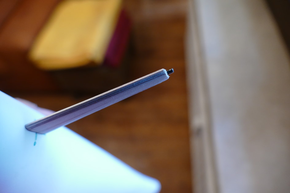 Normalerweise hätte ich mit einem dünnen Holzstab versucht, die Bänder in die hinterste Ritze zu bekommen. Dann habe ich mich doch anders entschieden. Anders als beim Drücken wird beim Ziehen von Bändern das Band gestreckt und gerade ausgerichtet. Deshalb habe ich mir aus 0,4 mm Sperrholz kleine Plättchen gebastelt, die ich an die Enden der langen Stränge geklebt habe (Sekundenkleber). Die Plättchen bekamen zwei Bohrungen (0,5mm). Durch die beiden Bohrungen habe ich einen dünnen Nylonfaden gefädelt. Die beiden Fadenenden habe ich durch ein Loch im hinteren Rumpfteil gefädelt. Nachdem alle Kohlefaserbänder so vorbereitet waren, habe ich nun die Bänder der Reihe nach getränkt, und durch ziehen der Fäden die getränkten Bänder in den Rumpf gezogen.