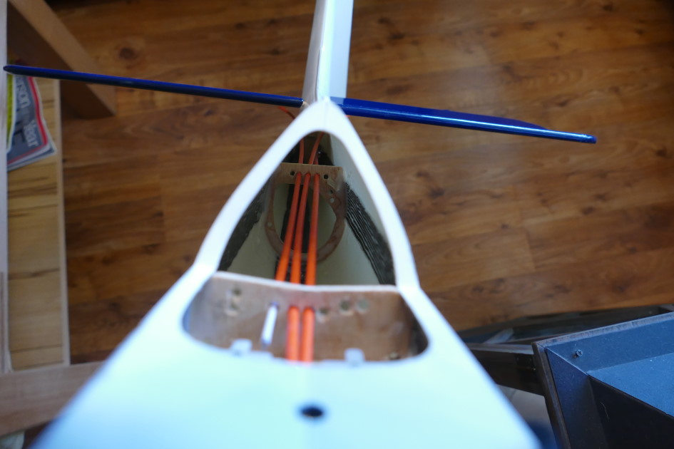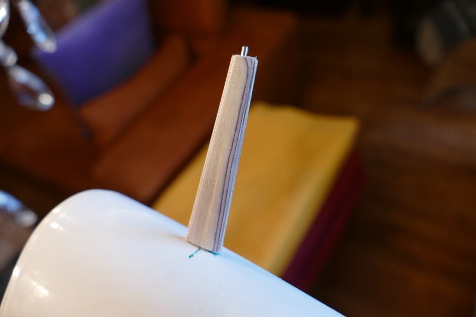 Hinten war klar, dass zwei Schrauben den Träger mit dem Rumpf befestigen. Vorne sah das anders aus. Der Rumpf ist sehr schmal und das Fahrwerk ist sehr weit vorne eingebaut. Schrauben fällt damit definitiv weg. Kleben wegen der Wartbarkeit auch. Die Lösung: ein eigener Spant in der Nase der Tigercat, mit einem Loch versehen, in das ein 8mm Kiefernhozdübel reicht. Der Dübel ist mit dem Träger verbunden.