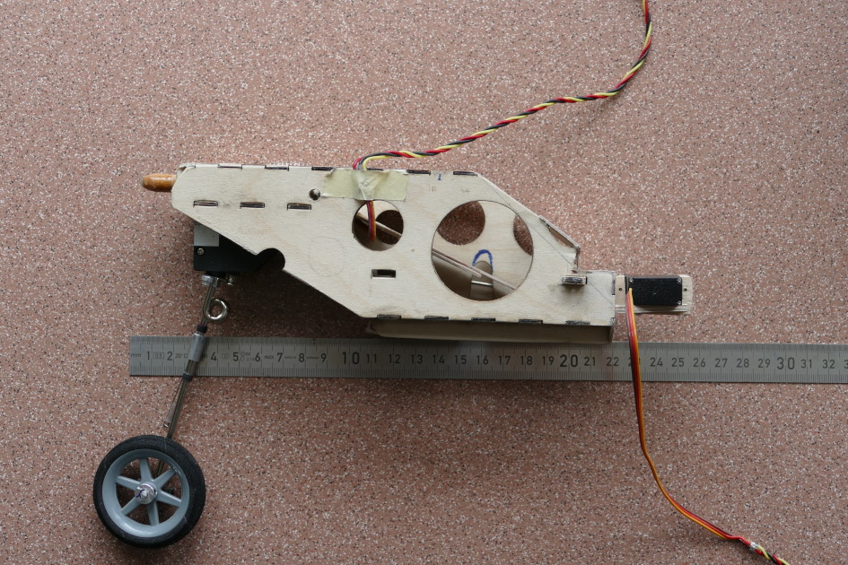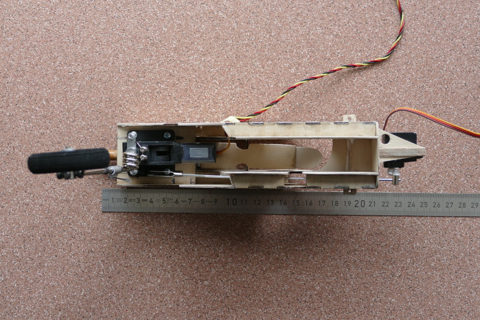 Man sieht recht schön, dass die Mechanik nun die Kopmpakteste ist, die ich je gebaut habe. das Servo, ein gutes Graupner mit viel Präzision und Kraft, betätigt nun die beiden Zug- und Schubstangen. Die gehen knapp am Rad vorbei, wobei die Umgehung der Nabe das größte Problem war. Dann tauchen die beiden Stangen ab und gehen über Kugelgelenke an die beiden Klappen. Natürlich habe ich nun wieder einen Doorsequenzer gebraucht, um das Konzert von Servos zu bändigen. Ich werde wohl demnächst noch einmal einen Doorsequenzer schreiben. Mein Code dafür ist grauenvoll, aber ich dachte, ich brauche ihn nur einmal bei der Eufi.