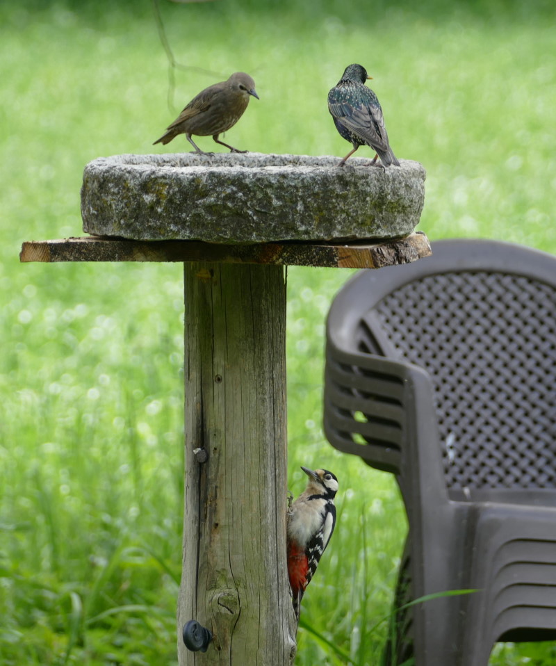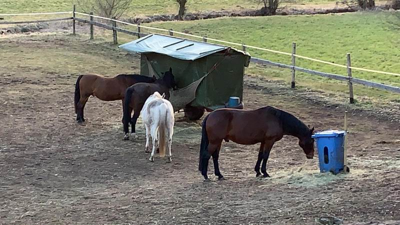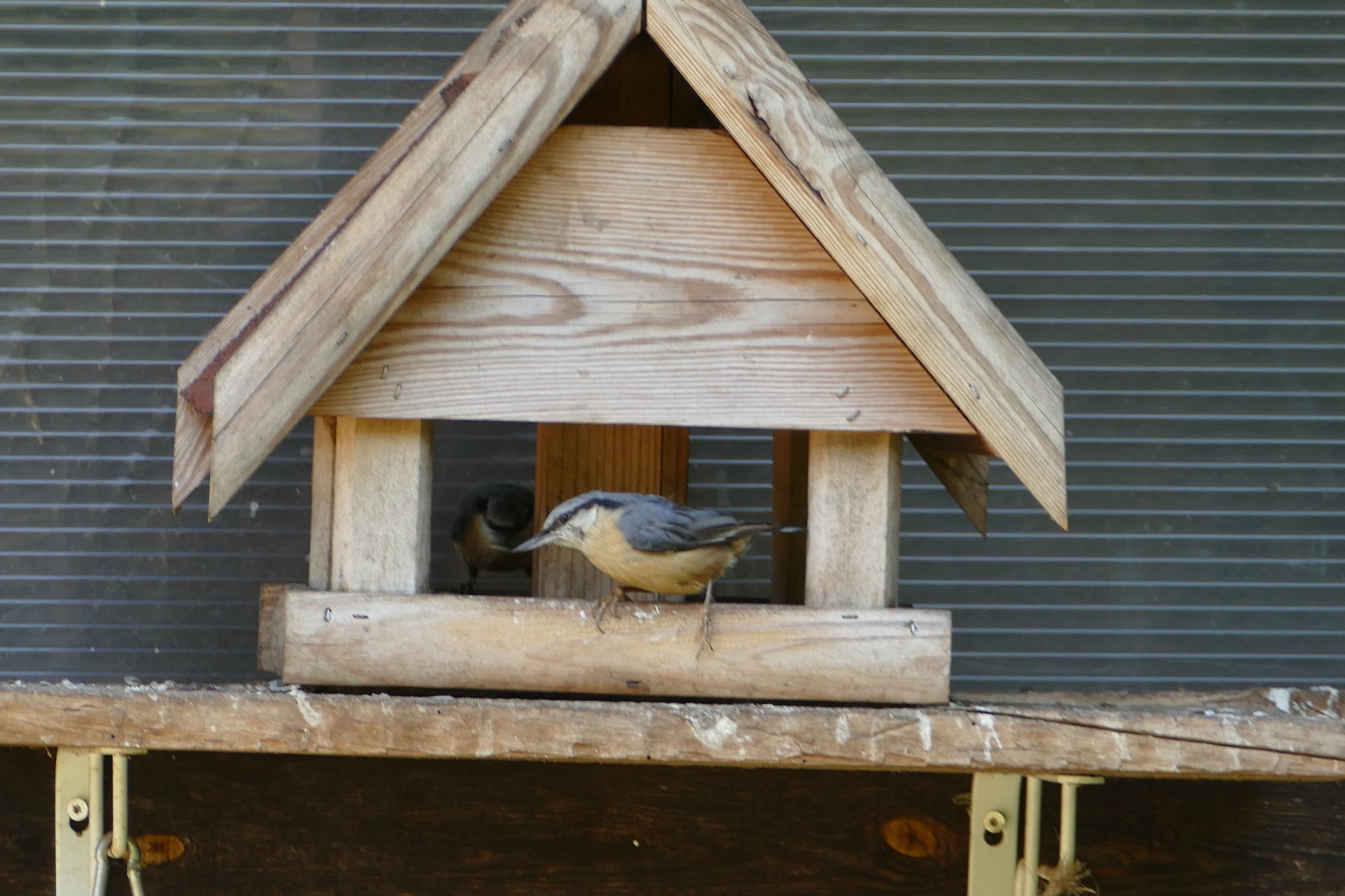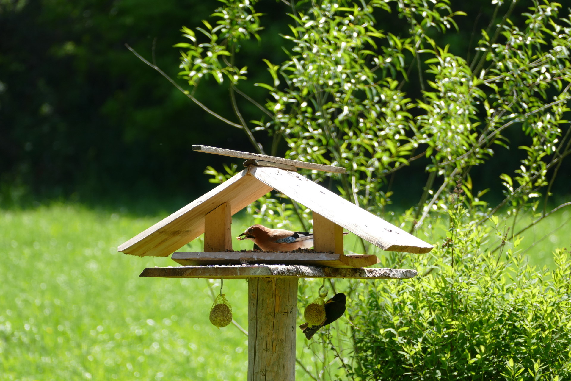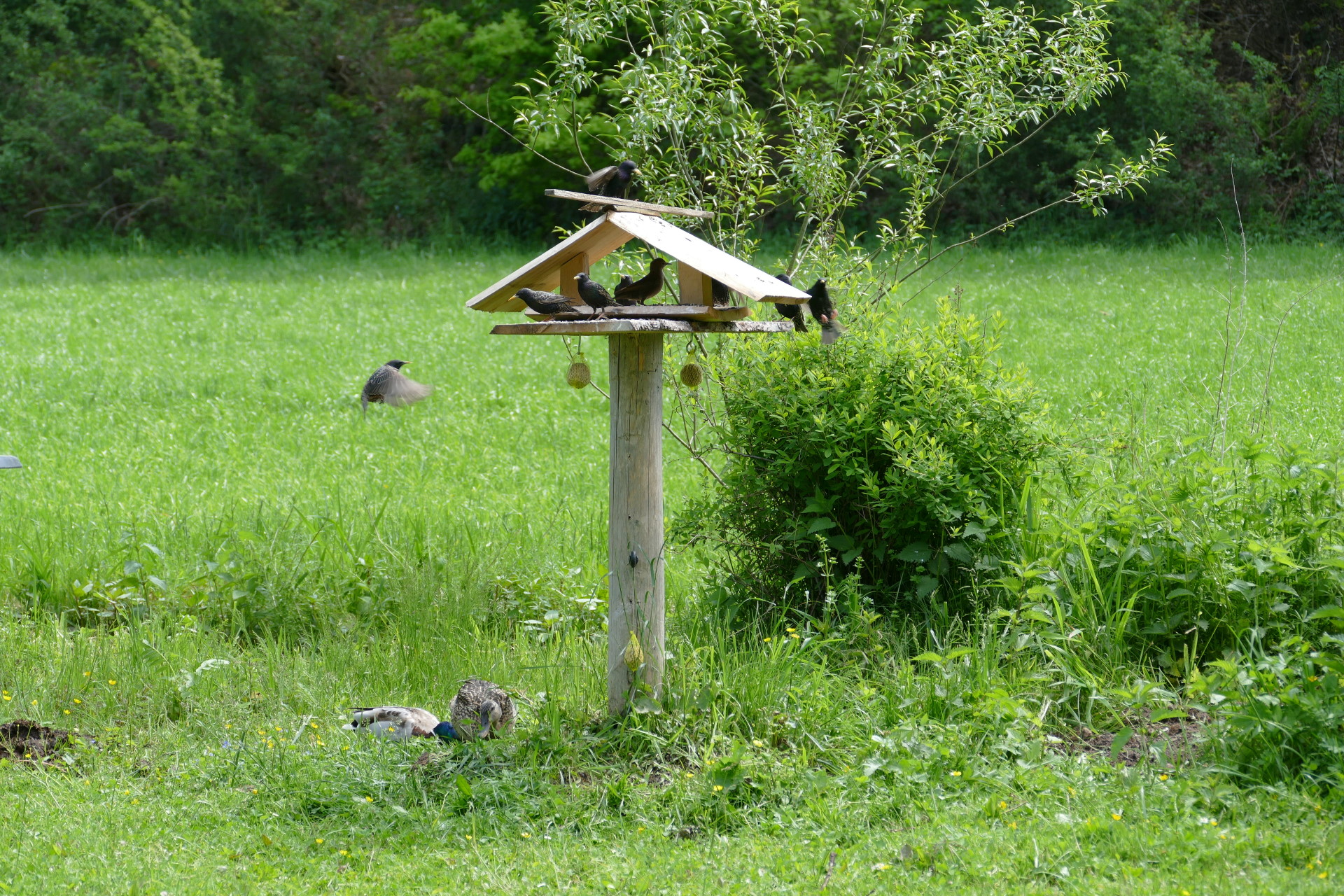 Inzwischen hat sich in der örtlichen Vogelwelt herumgesprochen, dass es hier Brutplätze, Futter und Schutz gibt. Aus dem Grund haben wir jede Menge Stare, Amseln, Eichelhäher, Körnerbeißer, Goldammern, Buntspechte und andere Vögel am Stall. Auch ein Entenpärchen ist eingezogen.