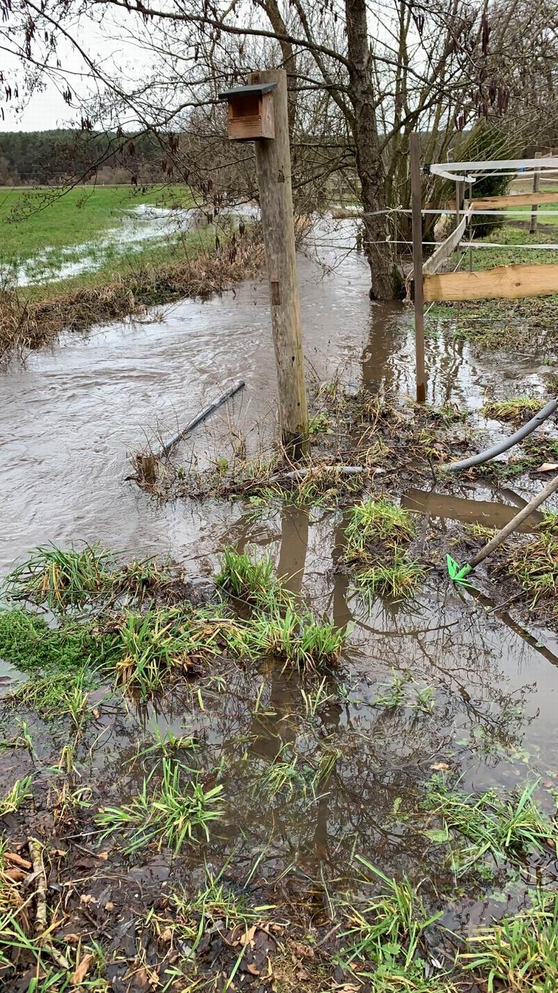 Es reichten 15 Minuten, um viele Straßen unpassierbar zu machen. Wir brachen sofort in Richtung Finsterbach auf, um die Weidenzäune zu prüfen und Schäden falls nötig notdürftig zu reparieren.