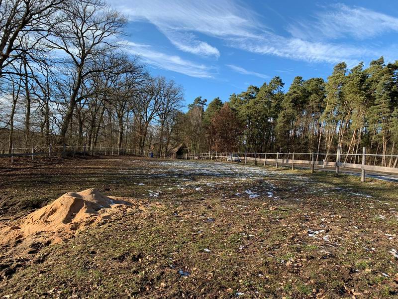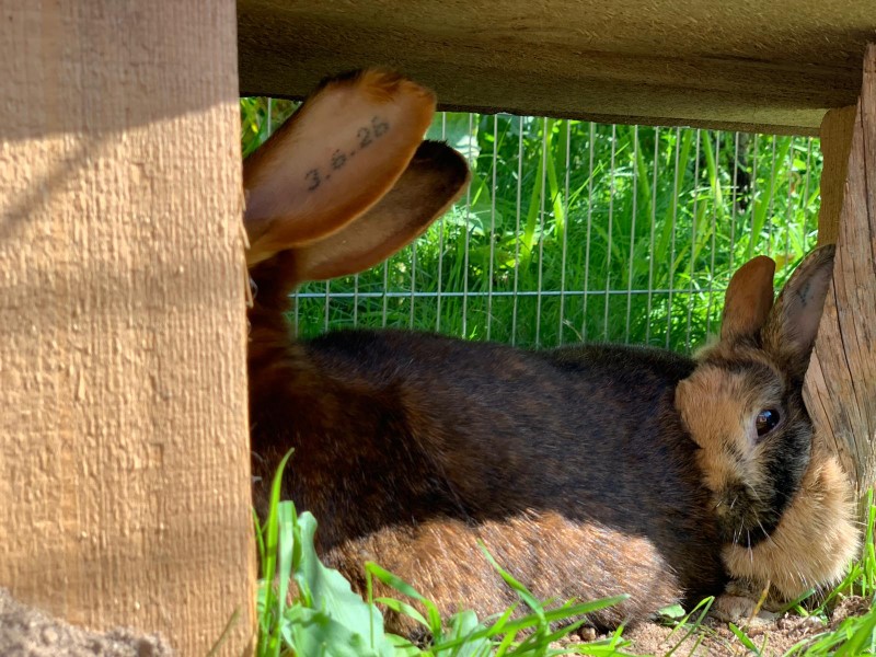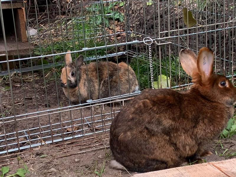 Zwischenzeitlich sind auch Hasen eingezogen. Sie haben ein recht großes Haus mit viel Auslauf-Käfig und können auch Löcher graben, wie sie wollen.