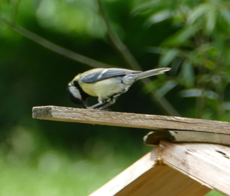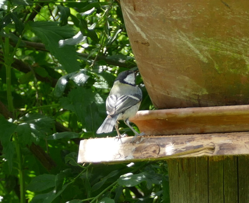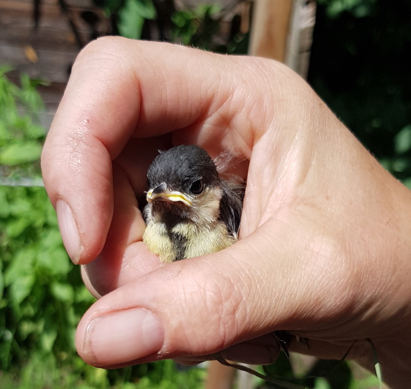 Hier ein Kohlmeisenküken, es war auf dem Boden gefallen und hat sich beschwert. Wir haben es wieder in den Busch, nahe des Nestes ausgesetzt.
