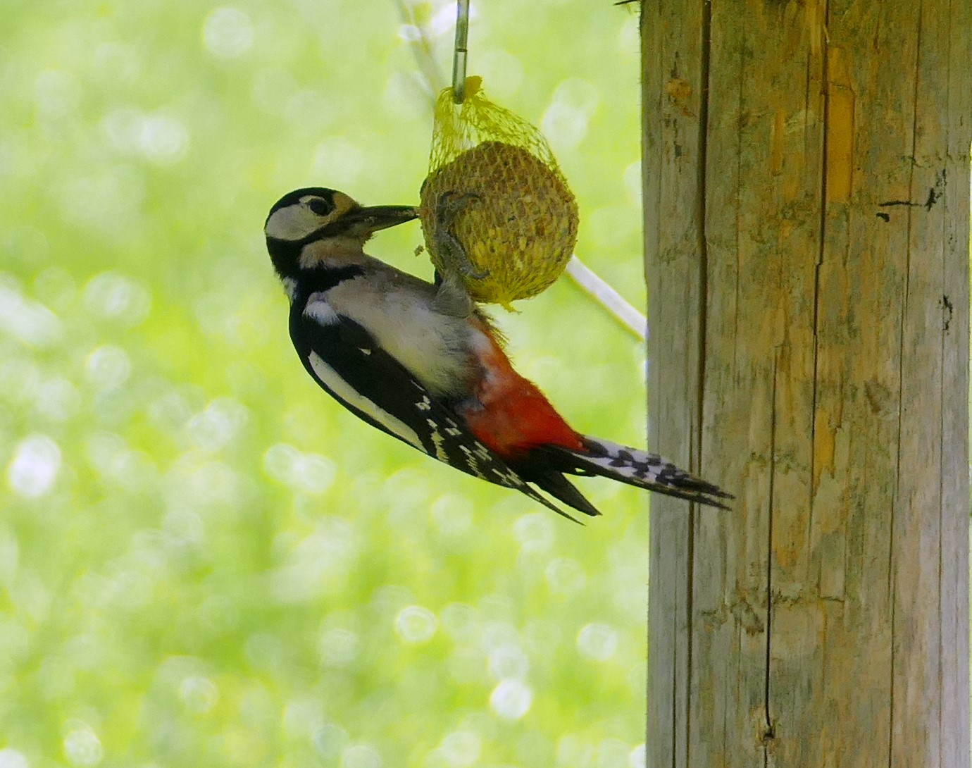 Buntspecht am Meisenknödel - verkehrte Welt...