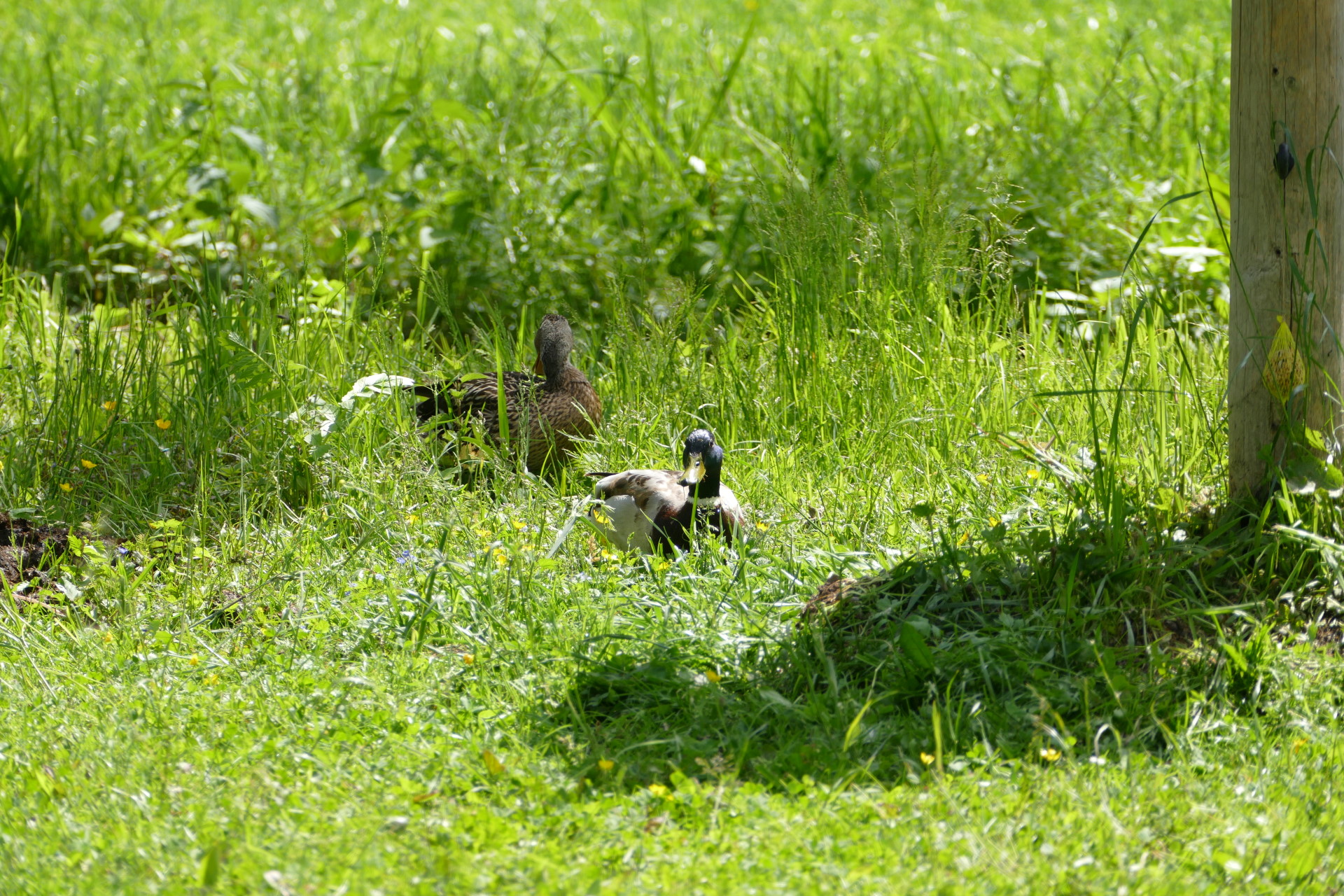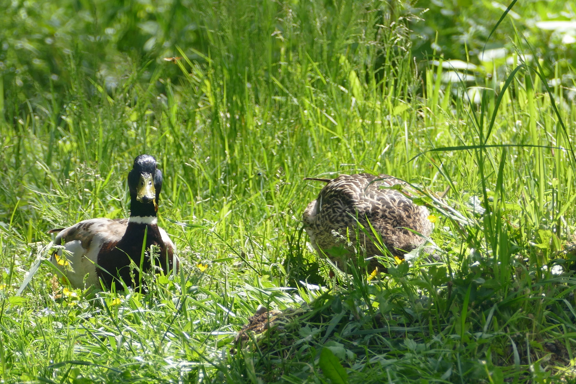 Unsere Entenpärchen findet es hier auch cool. Viele Körner von den Pferden, ein flacher Zugang zum Wasser und jede Menge Deckung.