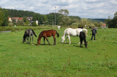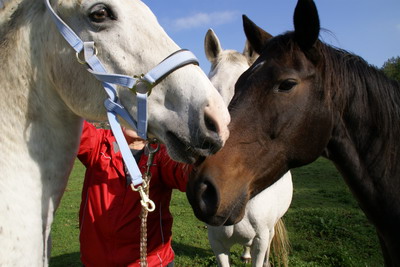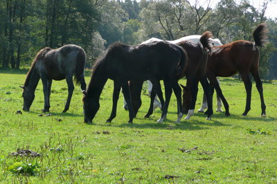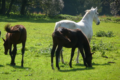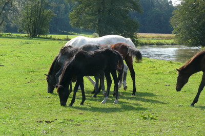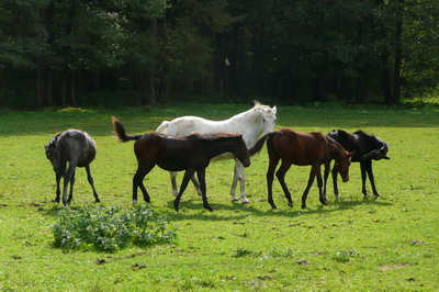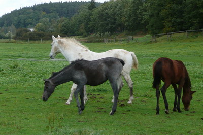 Das erste was Sano machte, war sich um die Fohlen zu kümmern. Er reagierte wie ein Hütehund, hielt die kleinen zusammen und beschützte sie vor allen "fremden" Mächten. Die Fohlen waren von Sano sehr angetan.