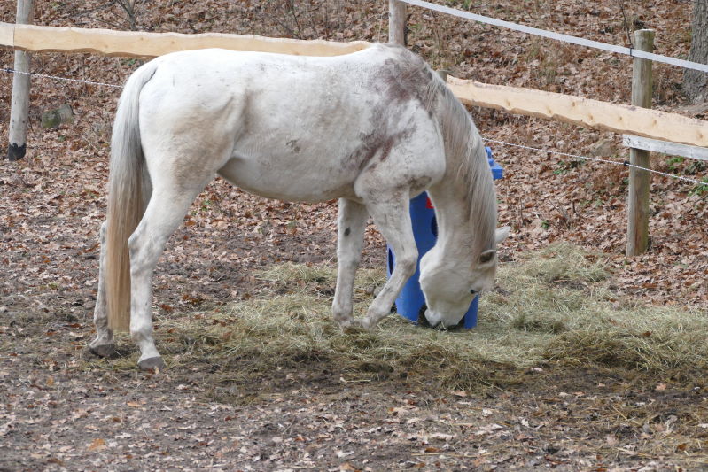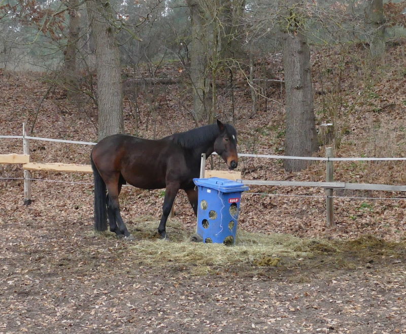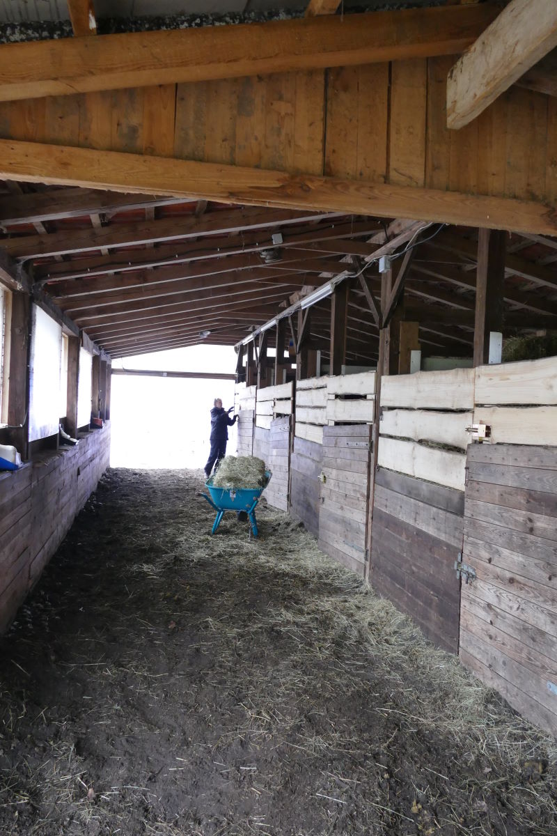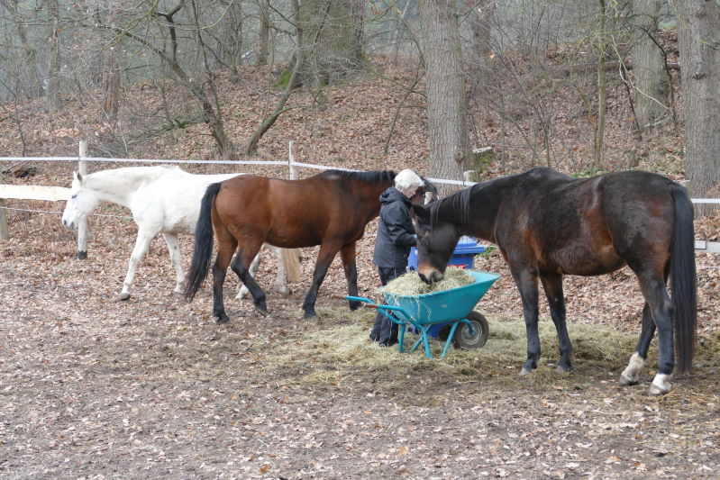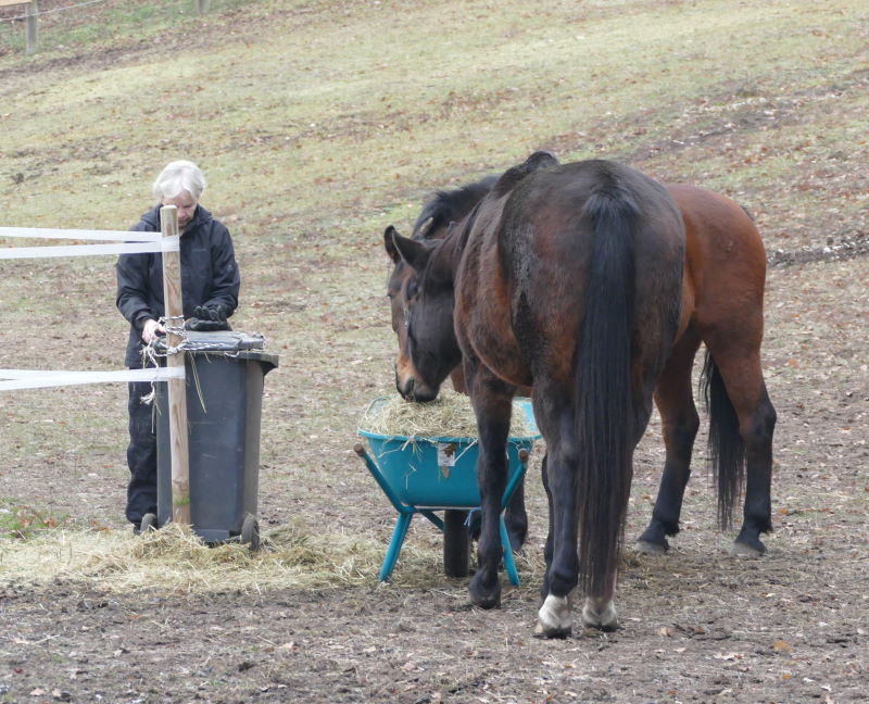 Uschi verteilt gerade das Heu an die verschiedenen "Servicestationen".