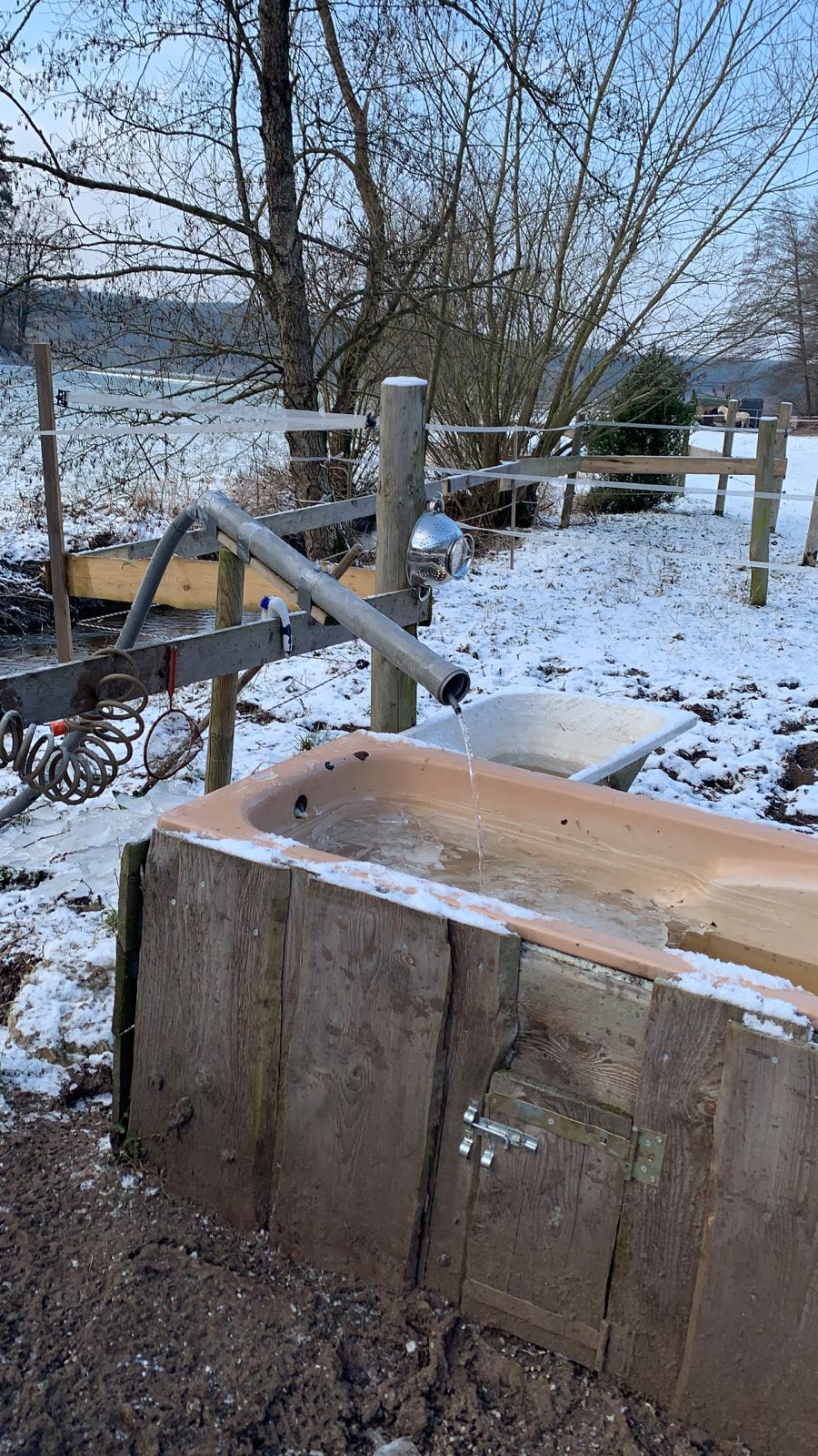 Ein anderes Problem ist dieses Jahr aufgetreten. Das Wasser für unsere Pferde stammt aus dem Bach. Ich habe eine kleine Tauchpumpe installiert, die über einen isolierten Gartenschlauch das Wasser in die Wanne laufen lässt. Schaltet die Pumpe aus, so entleert sich der Schlauch vollständig in den Fluß zurück, so dass im Schlauch kein Eispfropfen gebildet werden kann. Der Bach friert aufgrund der Flußgeschwindigkeit nicht zu, so dass die Pumpe selbst auch Eisfrei bleibt.