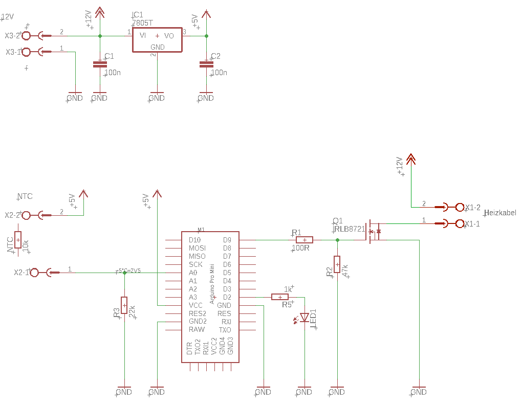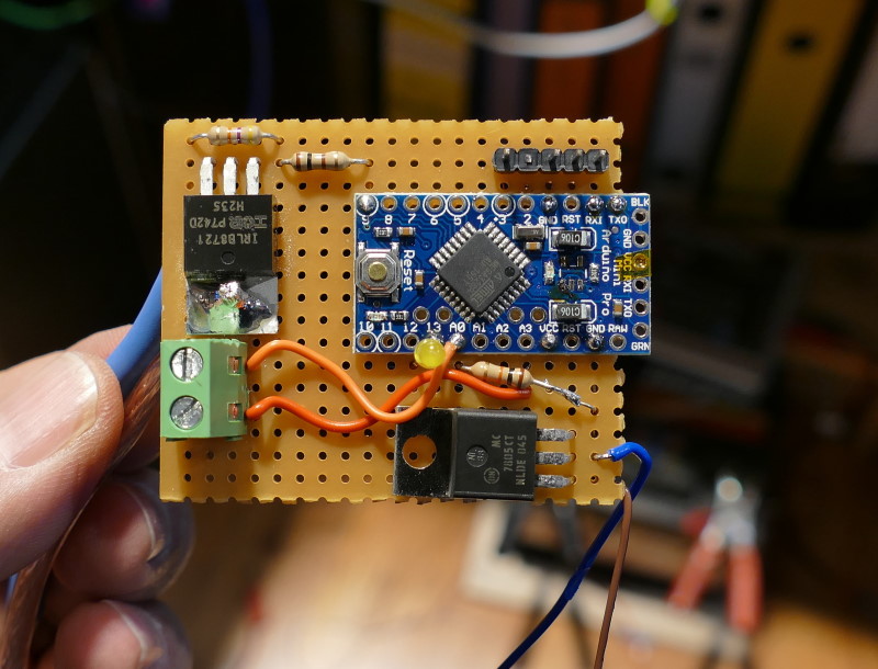 Bei dem Aufbau sind mir zwei Arduinos abgeraucht, weil sie den 12V in Verbindung mit einem NTC, einer Low-Current-LED und dem Fet nicht gewachsen waren. Da auf der Weide die "12V" ehrer ein 11V bis 15V sind (je nach Ladezustand des Akkus und dem Sonnenstand), habe ich einen TO-220 7805 spendiert - überdimensioniert, aber funktional.