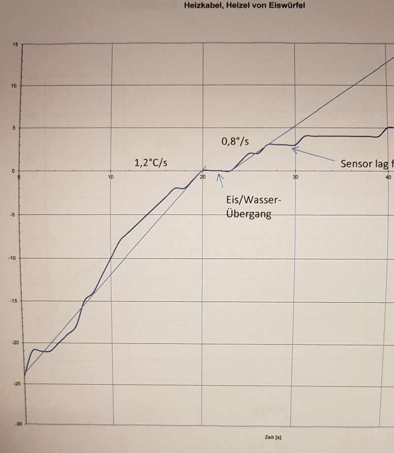 Schön zu sehen ist der Plateau-Bereich von 0°C kaltem Eis zu 0°C kaltem Wasser, der durch die Schmelzwärme entsteht.