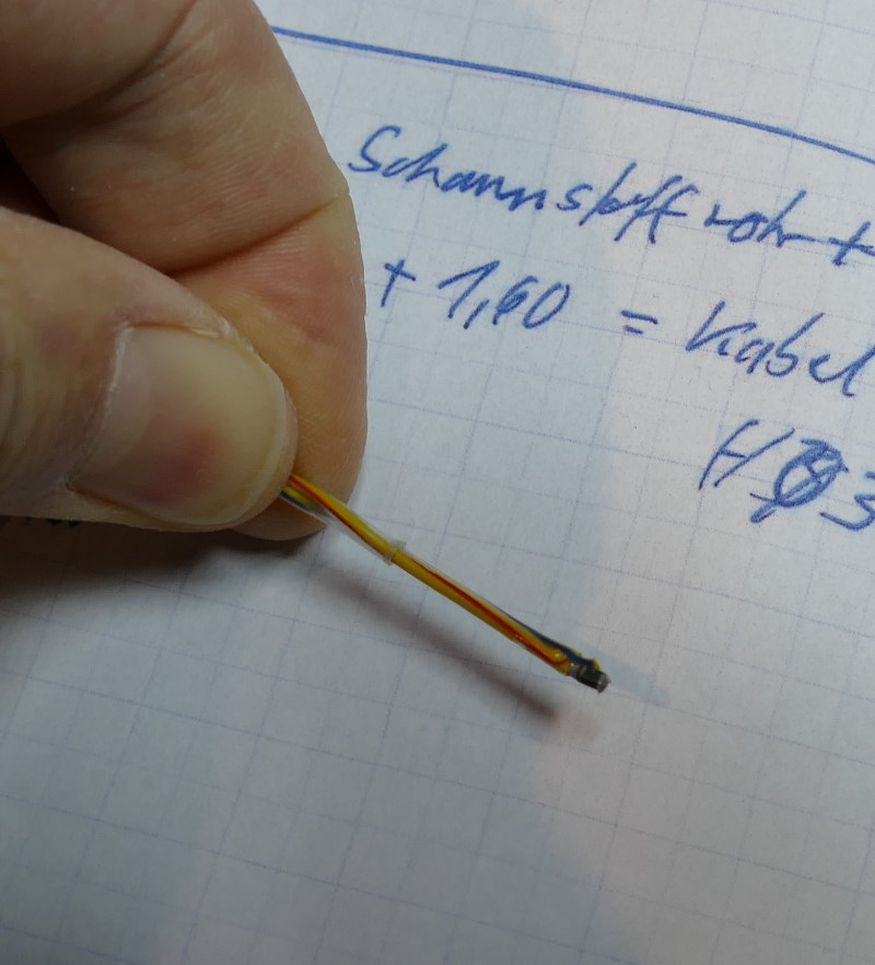 Das ganze habe ich nur noch einmal wegen der elektrischen Isolation in PU-Lack getaucht und dann an das Heizkabel geklebt. Ein Schrumpfschlauch erhöht die mechanische Robustheit.