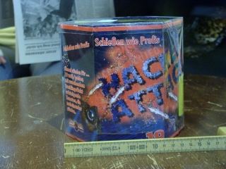 Batterien Sind grundsätzlich sehr sicher. Leider kann es trotzdem passieren, daß eine Batterie während des Abbrands umkippt. Dann wird es blöd, denn die Batterie feuert weiter und dreht sich im schlimmsten Fall um sich selbst. Da heißt es dann laufen und viel Glück! Außerdem können Funken und Effekte bis zum Boden ziehen. |