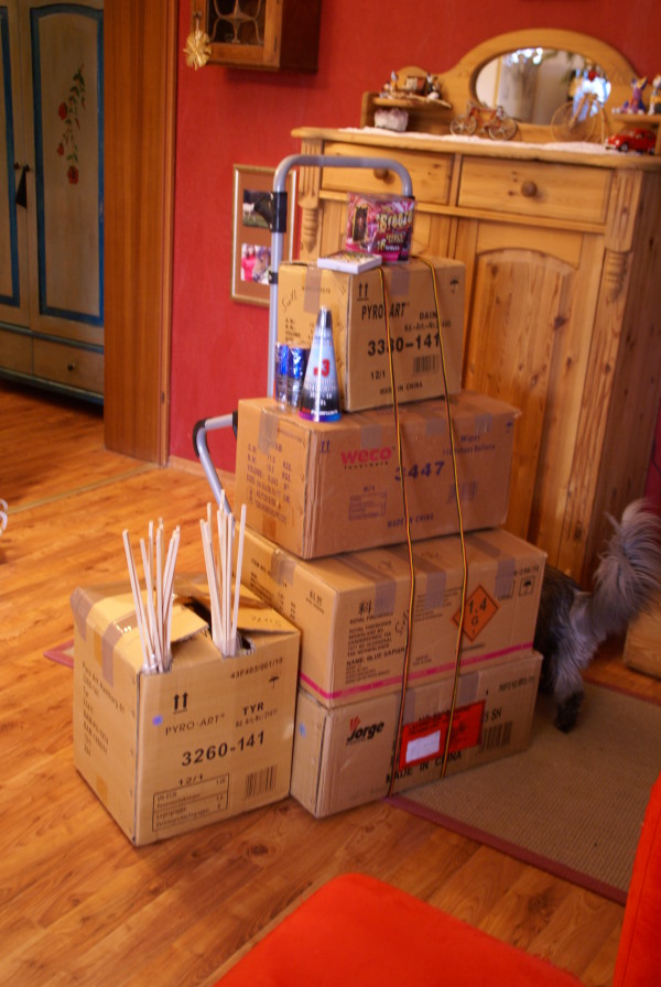 Hier ein Bild von allen Kartons. Letztes Jahr waren noch die Zündlichter durch allzu kompaktes Packen zu Knicklichtern geworden. Dieses Jahr war alles perfekt.