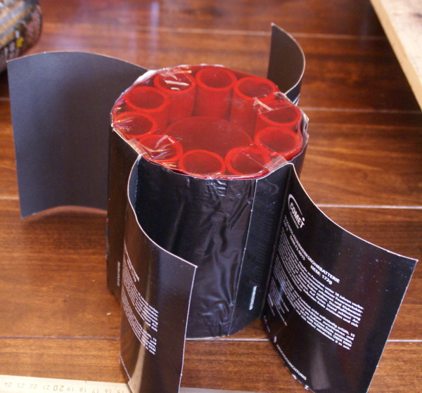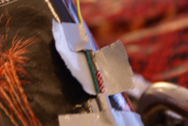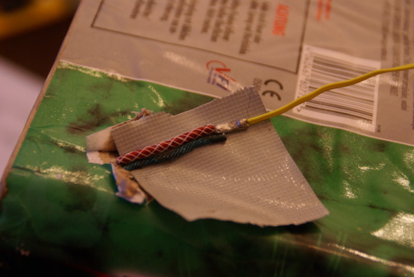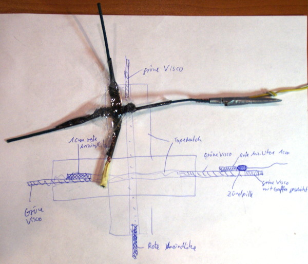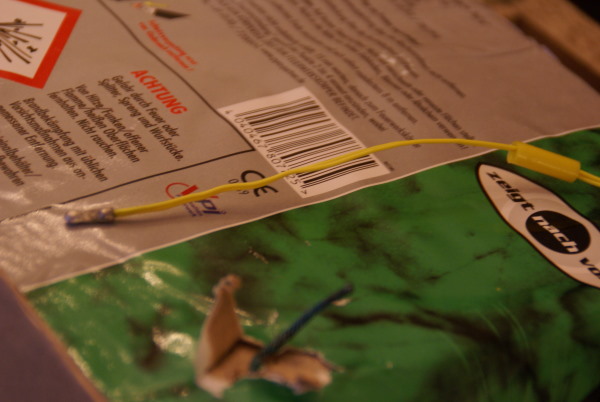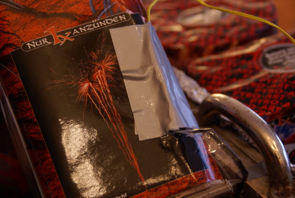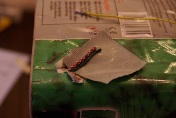 Das ganze habe ich noch mit einem zusätzlichen Stück Gewebeband gegen Funkenflug gesichert. Man sieht, daß von oben das Kabel des A-Zünders kommt und von unten der Tapematch-Strang heraus kommt, der nun an die restlichen Zündschnüre der anderen Effekte geklebt werden kann. Das Tapematch muß gegen Funkenflug gesichert werden (Alu-Klebeband oder Alufolie).