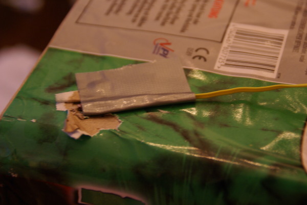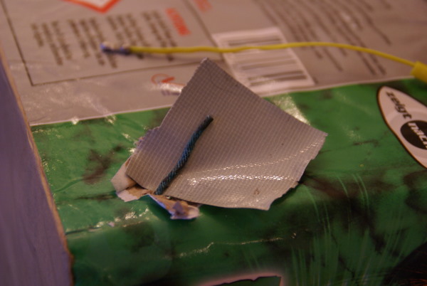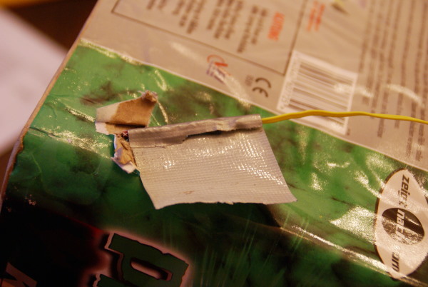 Nun wird die längere Seite des Gewebebands herumgeschlagen. Es entsteht eine klebrige Fahne die nun einfach an den Pyroartikel angedrückt wird. Damit ist eigentlich alles erledigt. Wer ganz sicher gehen will, macht mit dem Draht noch eine Schlaufe und klebt die am Pyroartikel fest. Damit ist eine Zugentlastung und noch ein paar Zentimeter "Sicherheit" beim Hängenbleiben am Kabel integriert.