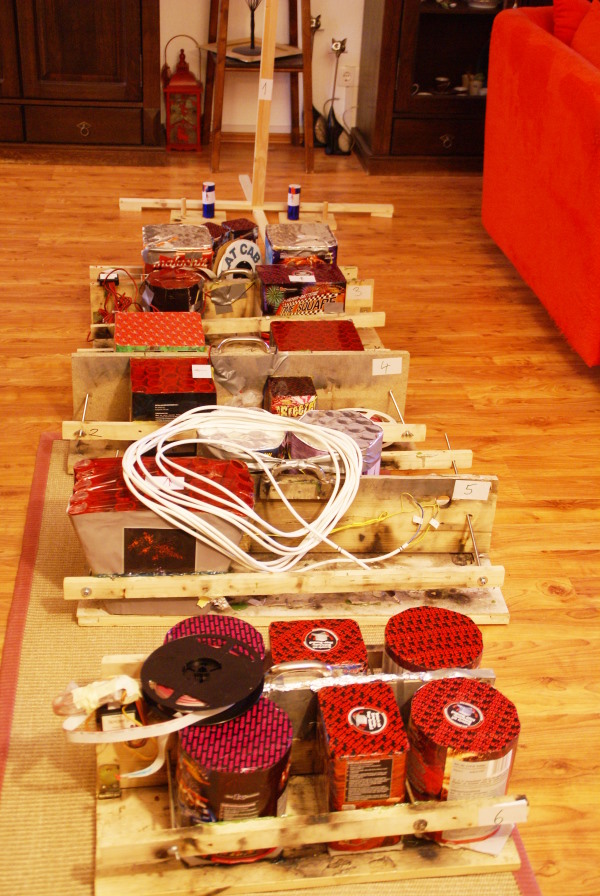 Hier sieht man die Aufteilung der Cakes für die einzelnen Cake-Halter und die Zuordnung der Zündkabel. Im Vordergrund der Teil, der auf den ersten Cake-Halter kommt.
