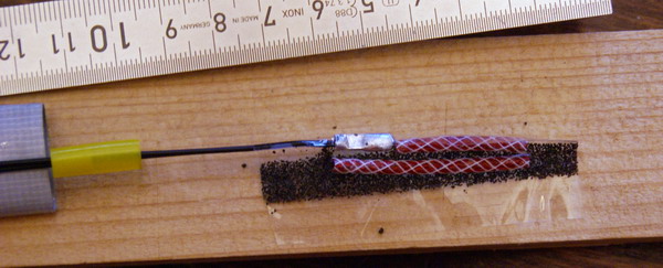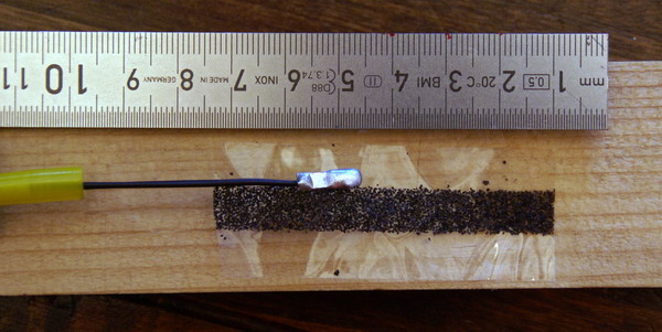 4cm Anzündlitze auf Holz mit Cuttermesser abschneiden und auf die Schwarzpulverbahn legen.