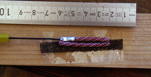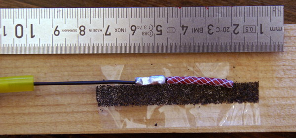 - Die Zündpille wird unmittelbar neben der Schwarzpulverbahn auf das Matchtape gedrückt. (klebt fest)