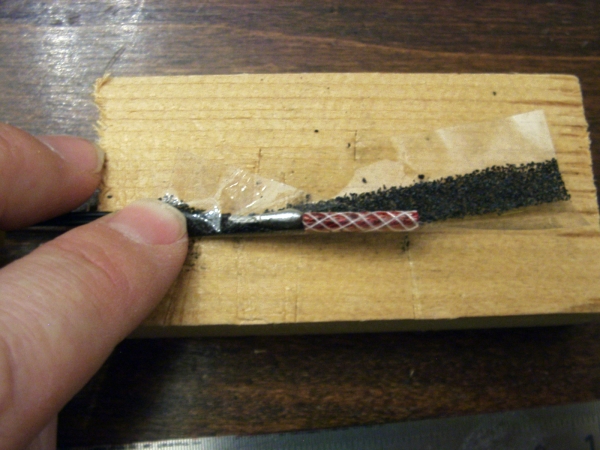 Ich habe diesmal bewusst möglichst viel elektrisch verleitet, d.h. nebeneinander angeordnete Batterien bekamen keine Litzenverbindung sondern zwei separate E-Zünder, die seriell verdrahtet wurden. Die Zündpillen habe ich wie beim letzten mal so wie auf dem Foto angebracht. Ein Stückchen Matchtape das als Funkenfänger dient wird unter die schräg angelegte Zündpille gesetzt, ein kleines Stück rote Litze wird an den Kopf angesetzt und die Visco des Pyroeffekts wird ebenfalls bis zur Zündpille reichend parallel zur roten Litze geleitet. Das ganze wird dann eingerollt und mit einigen Tesa-Klebestreifen mechanisch so stabilisiert, dass nichts mehr wackeln kann. Später habe ich begonnen die rote Litze schräg anzuschneiden. Das hat zwei Effekte: 1. mehr zündbare Oberfläche an der Litze, 2. die Litze verkeilt sich seitlich/flächig an der Zündpille, die Visco hat mehr Platz.