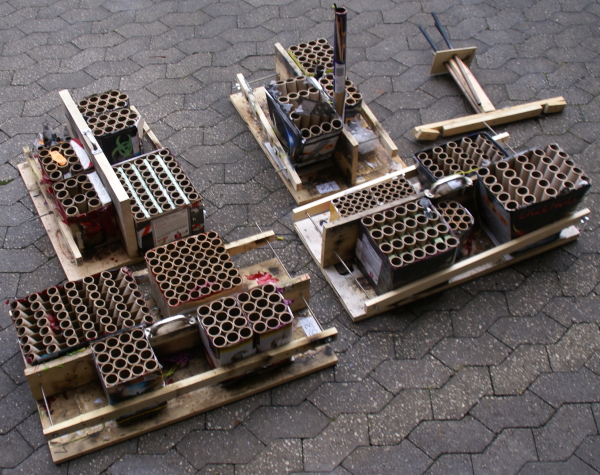Ich habe insgesamt 4 Bretter mit 4 Zündboxen (und jeweils 4 Kanälen) auf die Straße geschleppt, die Empfänger scharf gemacht und nach einer kurzen Zeit der Konzentration die Energie auf die Zündkreise gegeben. Die Durchgangsprüfung zeigte, dass alle Kanäle beschaltet waren und dann konnte es los gehen.