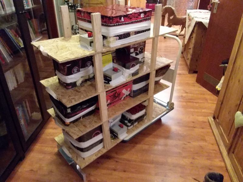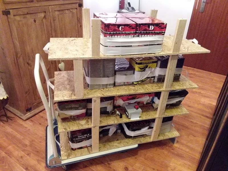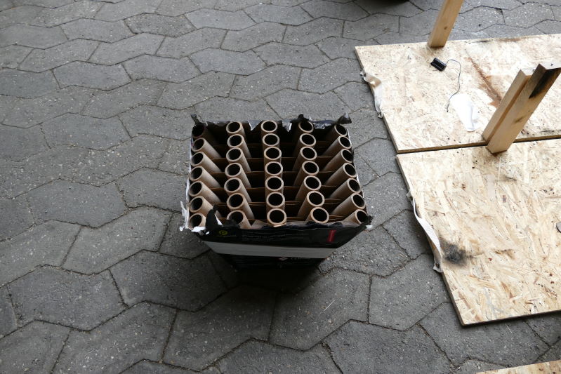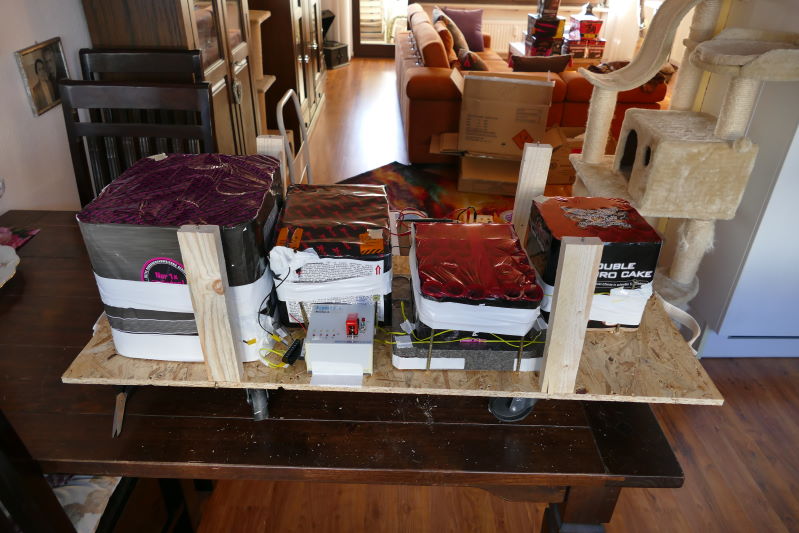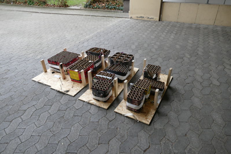 Dieses Jahr habe ich alle Cakes mit 120mm-Schrauben (neben die Cakes, NICHT in die Cakes) befestigt, in dem ich sie zusammen mit den Schrauben mit Panzerband umwickelt habe. Als Pretter habe ich die OSD3-Bretter vom Baumarkt zuschneiden lassen. Die Bretter haben an definierten Stellen Löcher, Dadurch können vier Leisten senkrecht befestigt werden. Die Leisten haben auf der anderen Seite Nägel....