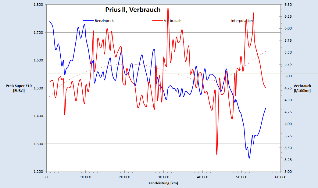 Gegenüber dem 500Tage-Bericht ist der Verbrauch nahezu gleich geblieben (war 4,99l/100km, jetzt 5,02l/100km bei einer Teststrecke von 56.171km). Meine ursprünglichen Befürchtungen, dass der Akku mit der Zeit nachlässt und dann der Verbrauch hoch gehen würde, hat sich bisher nicht bewahrheitet.