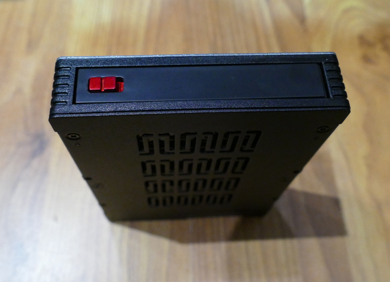 Vorne befindet sich ein Verriegelungschieber, der eine Klappe öffnet. In diese Klappe wird die 2,5" SSD/HDD eingeführt und anschließend wird die Klappe wieder verriegelt. Die Mechanik ist äußerst edel. Ein Auswerfer hilft automatisch beim entfernen einer eingesteckten Festplatte. Außerdem werden die Kontakte der Festplatte lt. Hersteller durch eine spezielle Mechanik gegen Verschleiß beim Wechsel geschützt.