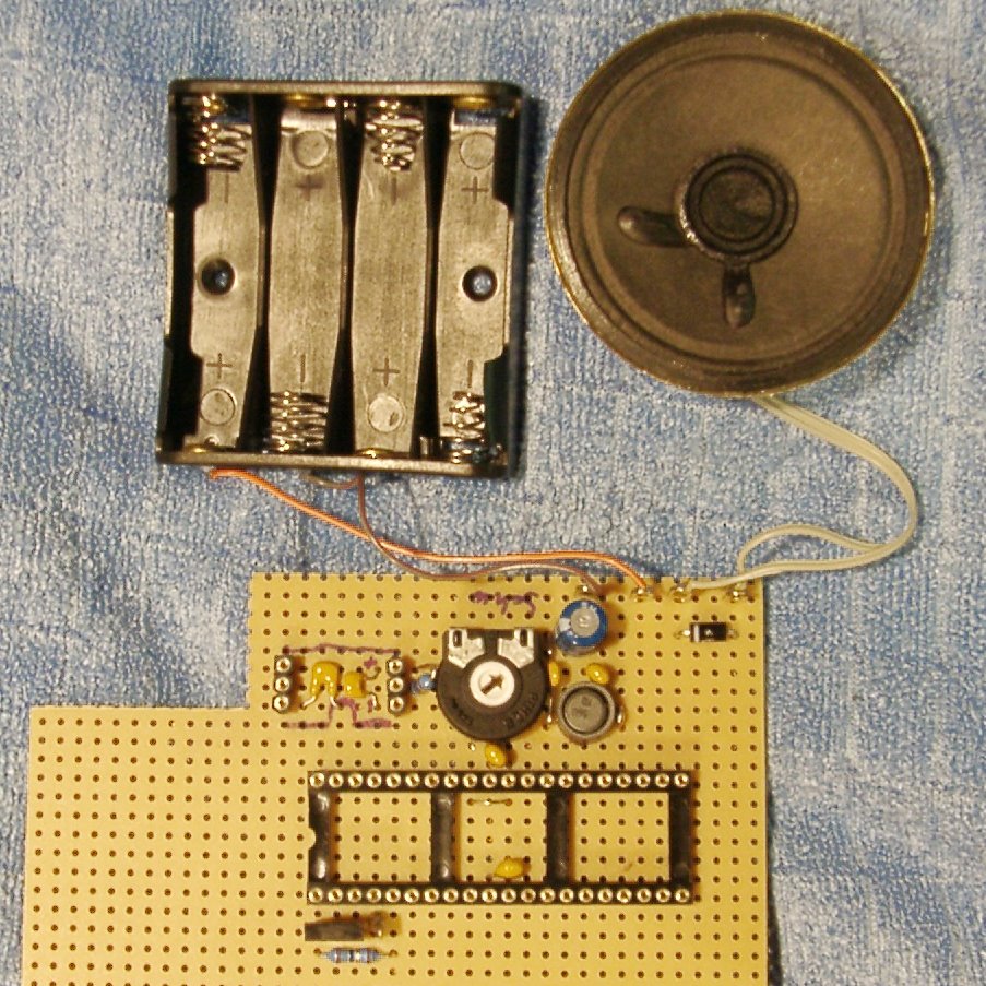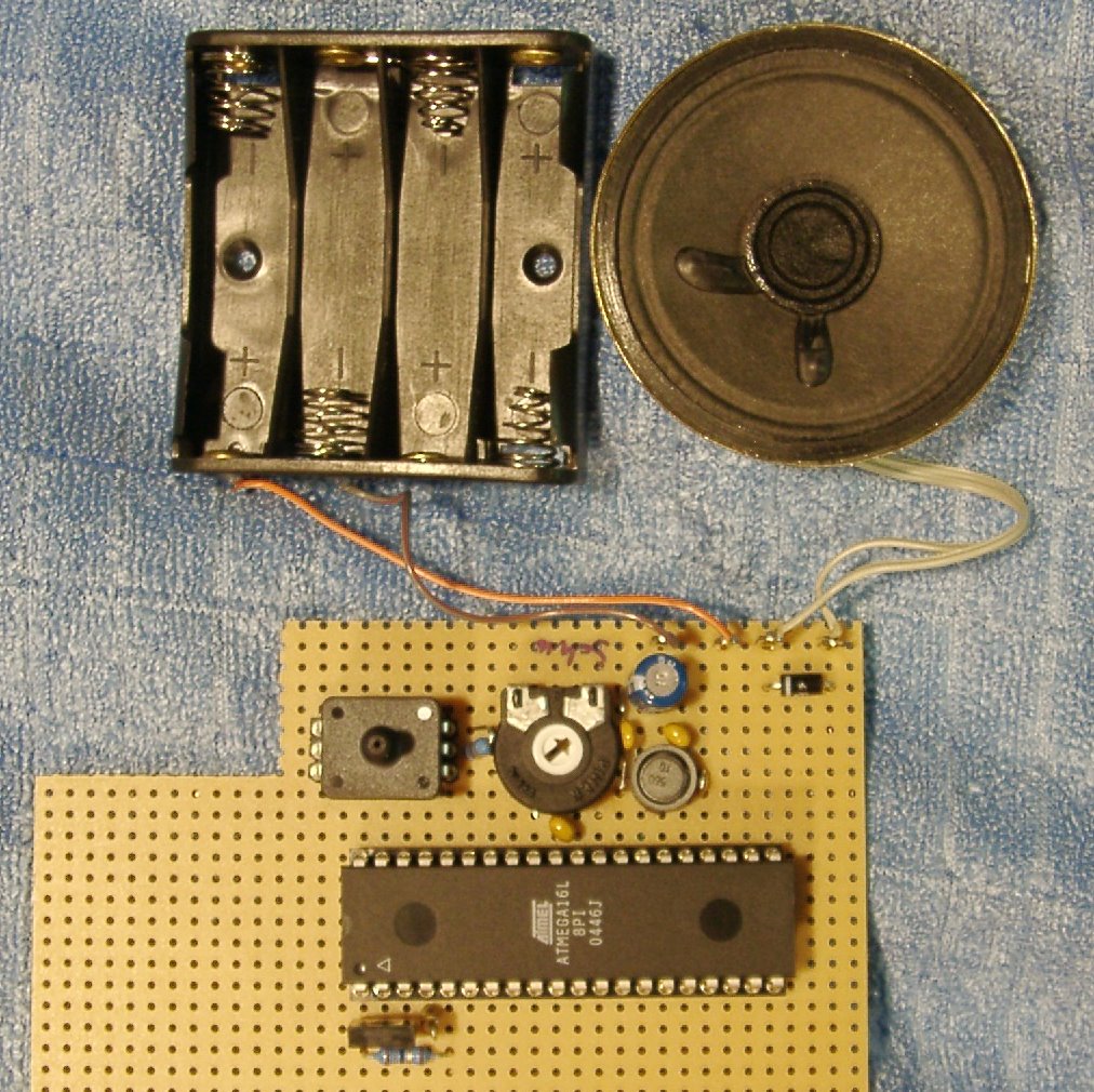 ...soll ein neues zu Hause bekommen. Eine Lochrasterplatine mit einem kleinen Prozessor, einem Poty und einem Lautsprecher.