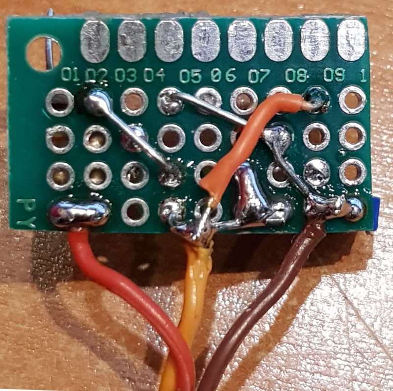 Auf der Rückseite sind einige wenige Verbindungen zu erstellen. Braun ist GND, Rot ist +5V und Orange ist das SIGNAL.