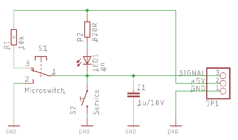 Wird nun ein Filament eingeführt, schließt der Mikroschalter den Kontakt 2-1 auf GND (Masse). Die LED leuchtet über den Strombegrenzungswiderstand R2. Als LED habe ich eine grüne LED (low Current, 2mA) vorgesehen.