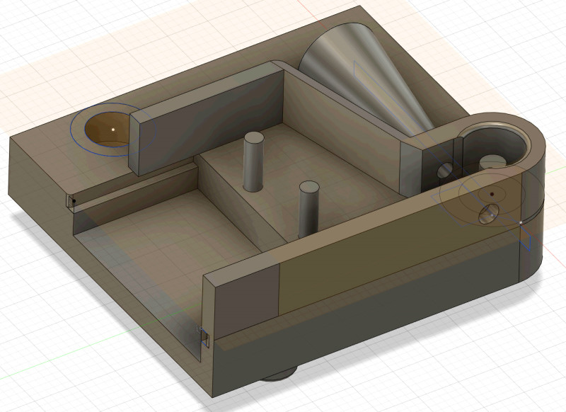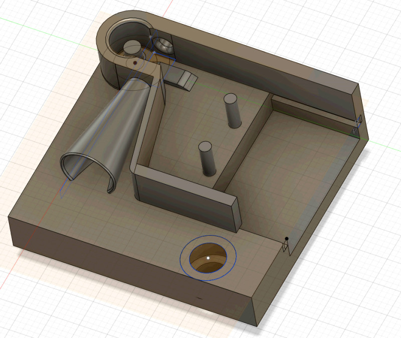 Relativ schnell war mir klar, das die Anforderung auf minimale Reibung bedeutete, dass der Mikroschalter mit einer Rolle ausgestattet sein muß und das Gegenlager ein Kugellager sein muß. Das Filament sollte nur mit dem Kugellager und mit der Rolle kontakt haben, aber wie wird dann das Filament geführt? Die Idee war, dass die beiden Bohrungen im Sensorgehäuse deutlich größer sind, als das Filament selbst.