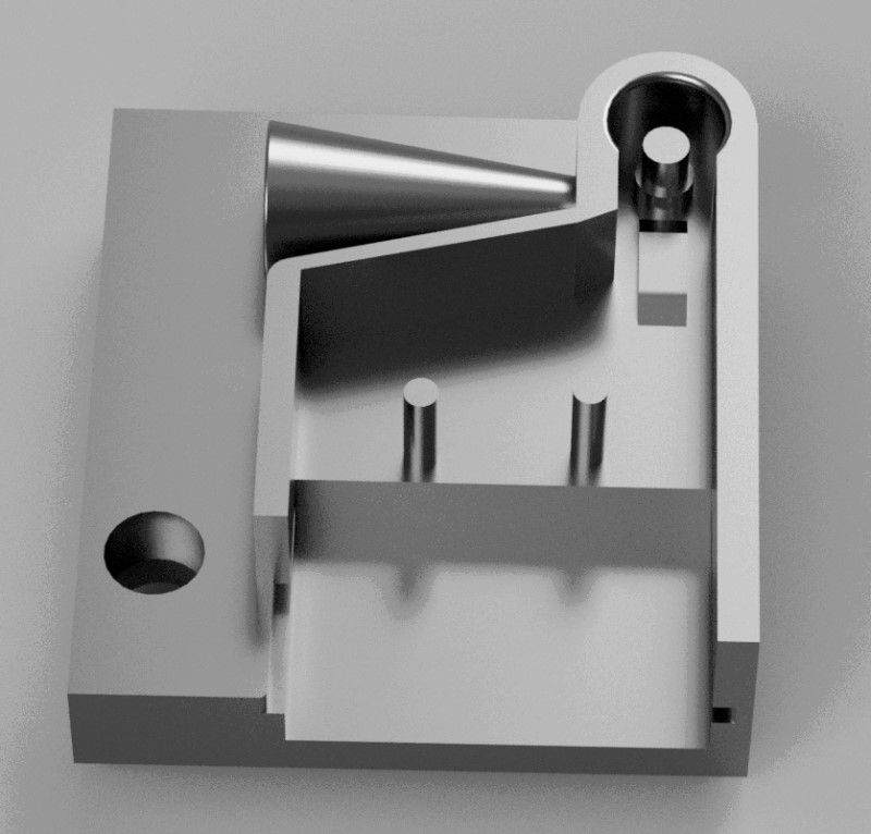 Ein kleiner Trichter führt das Filament von einem Öffnungsdurchmesser von 10mm zu einer Bohrung von 2.1mm (Filament hat einen Durchmesser von 1,75). Durch die Trichteranordnung kommt das Filament unmittelbar an der Kugellager/Rollenkombination in den Sensor. Der Kugellagerrand ragt 0,1mm in das Eingangsloch hinein, so dass das Filament nicht am Lochrand, sondern am Kugellagerrand aufliegt. Führt man nun das Filament in den Sensor ein, drückt das Filament die Rolle des Schalters weg (der Schalter schaltet). Das Filament hat durch das Kugellager an der Stelle eine sehr gut definierte Lage. Es ist dadurch kein Problem, dass das Filament sich anschließend durch das kegelförmige Loch am Ende des Sensors fädelt. Letzteres hat einen Durchmesser von 2,5mm und berührt das Filament ebenfalls nicht.