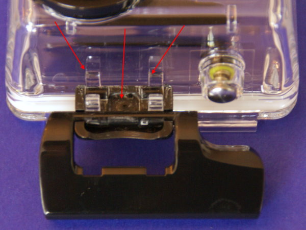 Beim Schutzgehäuse habe ich mir am Anfang ganz schön die Finger verbogen und hatte kurzzeitig sogar den Eindruck, daß ich das Plastik-Verriegelungsteil abgebrochen habe. Ich hatte es nicht, aber ich habe das Verriegelungsteil weil es aus der Halterung war gleich einmal mit Teflon-Spray (Kontakt-Chemie Kontaflon 85) eingesprüht. Nach dem Trocknen des Films habe ich die Verriegelung wieder in das Gehäuse geschnappt und nun geht das Ver- und Entriegeln wie es sich gehört.