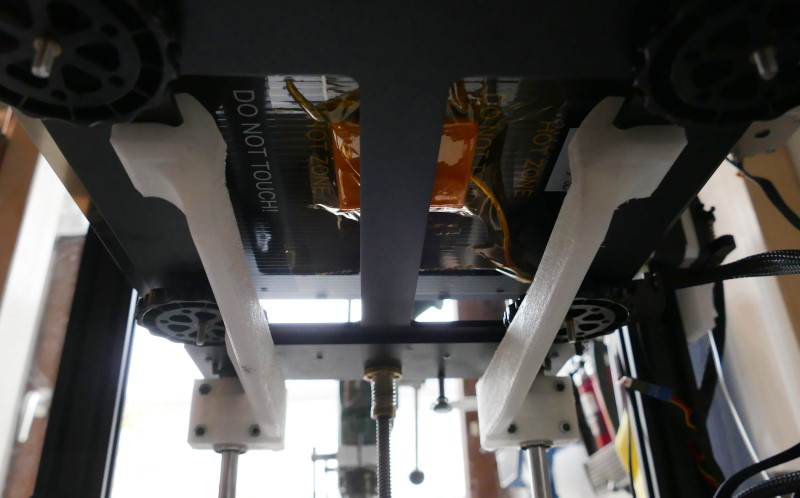 "Ender 5 bed supports (The Original "Super Struts")" Die Z-Achse wird beim Ender nur auf einer Seite geführt und dort ist auch das Bett fest gemacht. Bei großen, schweren Drucken kann das dazu führen, dass das Bett nicht mehr im 90° Winkel zur Z-Achse steht. Diese Stützarme sollen das verhindern. Sie sind recht stabil. Aber: ich hatte die Teile in PLA gedruckt und inzwischen sind die an der Führung so geschmolzen, dass von einer Stabilisierung nicht mehr zu sprechen ist. Dieses Teil braucht zwingend PETG/ASA/ABS.